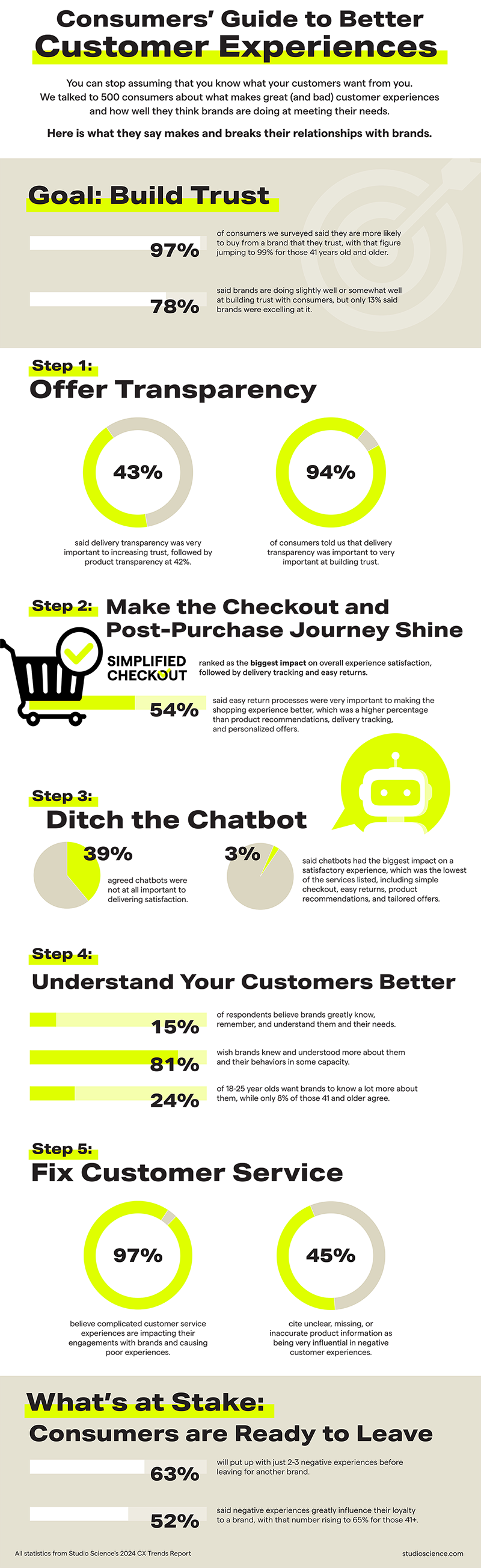If you want the full deep dive, you can read all the findings in our 2024 CX Trends Report. And to give you a taste of what to expect, we took what these consumers told us and built a five-step guide to creating better customer experiences, along with what’s at stake, in the infographic below.
